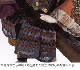 独特な衣裳人形である竹田人形は、当時としてはハイカラな別珍(べっちん)を襟(えり)に使ったり、袖に剛毅(ごうき)な龍の刺繍を施すなど、派手派手しい作りです。