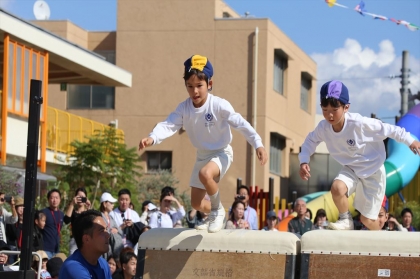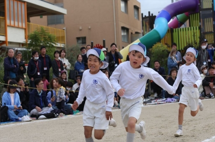 まずはかけっこからスタート。年長さんの走りは迫力満点。腕の振りも足の運びも力強く、ゴールをめざすその表情はどこか頼もしさを感じます。みんなで励まし合いながら、全力で走りきる姿にこれまでの積み重ねが感じられました。