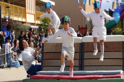 続いては年長さんの障害物競走!ハジゴを渡って、ネットをくぐって…最後は跳び箱ジャンプ!「早くゴールしたい!」って気持ちがあふれて、横を見ながら飛んじゃう子や、勢いあまって転んじゃう子も。でもすぐに立ち上がって走り出す姿に拍手がいっぱい!
