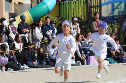 お昼からは、年中・年長さん2班の運動会!青空の下、まさにベストコンディションでスタートしました。トップバッターはかけっこ。年長さんの走りは迫力満点!力強い足取りに「絶対1番になる!」というオーラがムンムン伝わってきます。年中さんも、初めての長いトラックを最後まで一生懸命に走りきりました。
