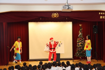 今年のクリスマスイベントには、昨年二月にも来てくださったガーガーズさんが参加してくださり、子どもたちは朝からわくわくが止まりませんでした。ステージが始まると、ガーガーズさんのプロフェッショナルなステージは、ただ見るだけではなく、自然と参加したくなる工夫がいっぱいで、歌って踊って、まるでライブのような空気の中で、一緒に声を出したり、心も体も思い切り動かして楽しんでいました。